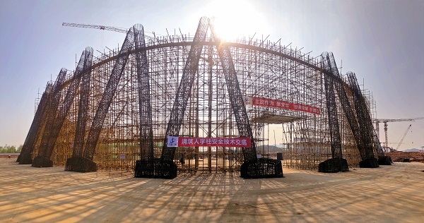 烟塔施工分公司湖南岳阳电厂2×1000MW机组1号排烟冷却塔人字柱混凝土正式浇筑